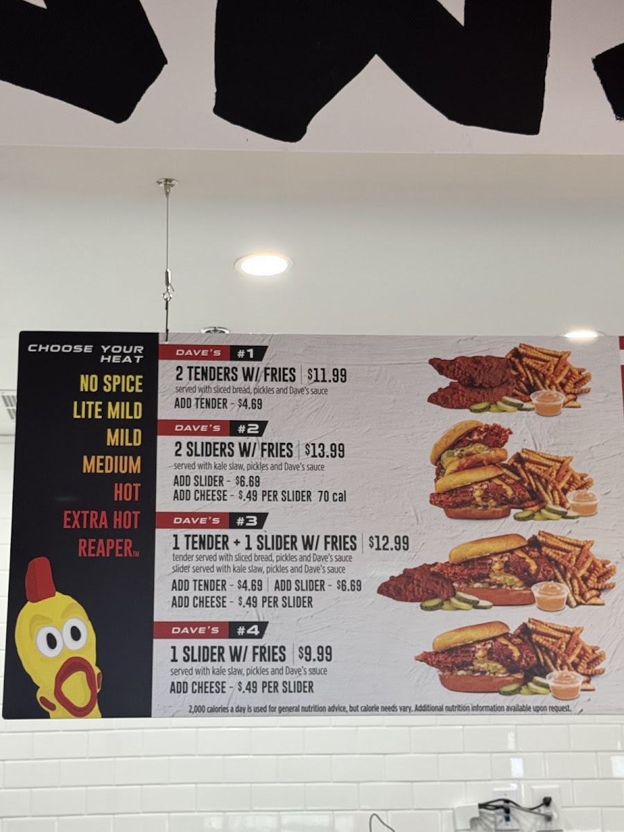 10 sliders (4 mild, 5 medium, 1 Reaper®...are you ready?) **DAVE'S HOT CHICKEN® REAPER® WAIVER By ordering and eating the REAPER®, you acknowledge its extreme heat and potential risks, including injury, property damage, distress, or death. You release and hold Dave's Hot Chicken, its affiliates, and employees harmless from any claims related to consuming the REAPER®, including REAPER ROULETTE®. By ordering, you confirm you are 18+ and legally capable of accepting this waiver. Eat at your own risk!
