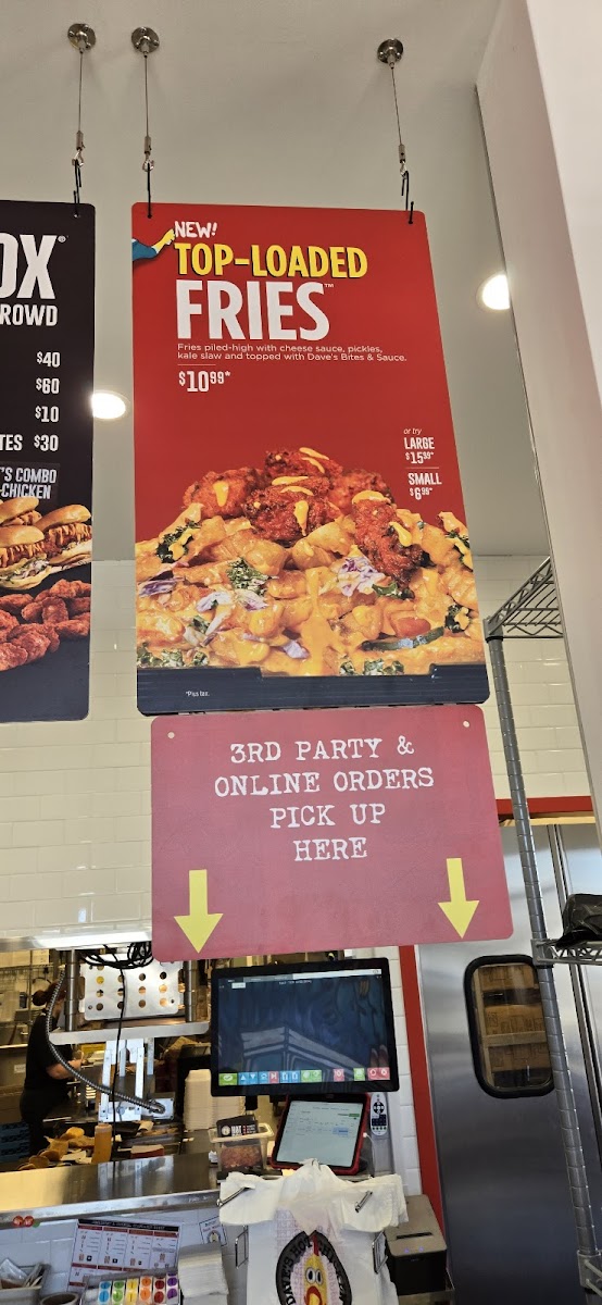 Fries piled high with cheese sauce, pickles, kale slaw and topped with 10 Dave’s Bites and drizzle of Dave’s sauce.
